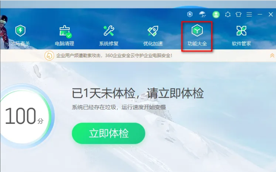1、打開360安全衛士以后在右上角找到功能大全點擊進去。