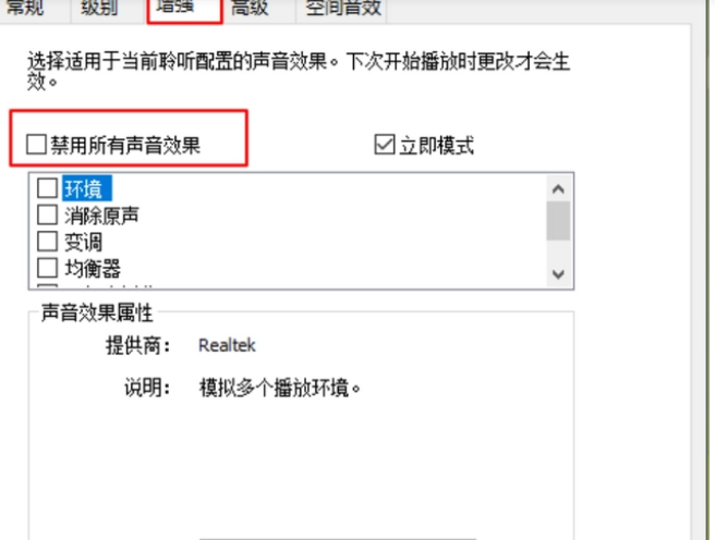 5、點擊“增強”菜單選項,取消勾選“禁用所有聲音效果”,然后點擊“確定”。