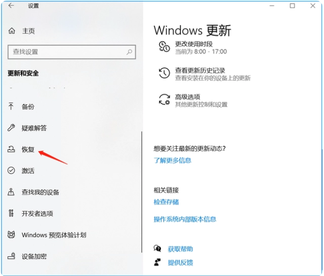 1、按住win+i,在彈出的windows設置對話框中,點擊更新和安全選項,在彈出的設置對話框中,點擊左側的恢復選項,如下圖所示: