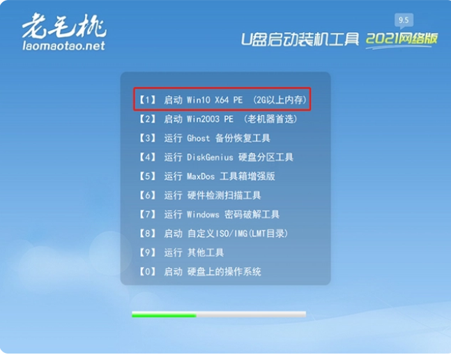 3、以老毛桃2021網絡版9.5系統盤為例,選擇第一項,按回車,如下圖所示: