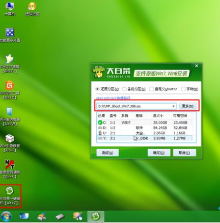6、完成分區后,打開【大白菜一鍵裝機】,映像路徑選擇系統iso鏡像,軟件此時或自動提取gho文件,點擊下拉框,選擇gho文件。