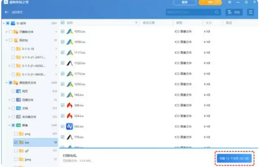 4. 掃描完成后,選擇你需要的數據,然后點擊“恢復x個文件”,再選擇恢復文件的保存位置即可。