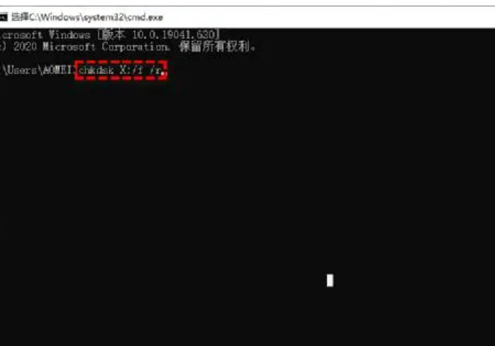 2. 輸入命令chkdsk X:/f 并按“回車”,等待完成即可。