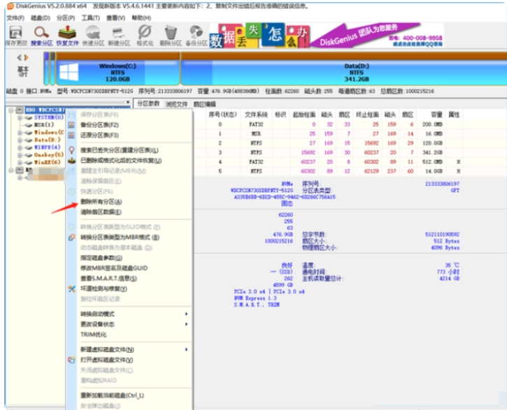 2、雙擊打開pe桌面的DiskGenius分區工具,右擊電腦磁盤,選擇刪除所有分區。