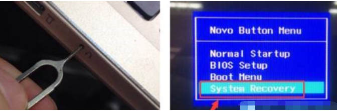 將聯想ideaPad 15s 2022電腦強制關機,找一根卡針,插入筆記本的一鍵恢復小孔(不同筆記本恢復孔的位置不一樣),進入Novo Button Menu,按下方向鍵選擇,并回車System Recovery選項。