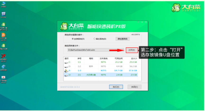 12、點擊“打開”選存放鏡像U盤位置。