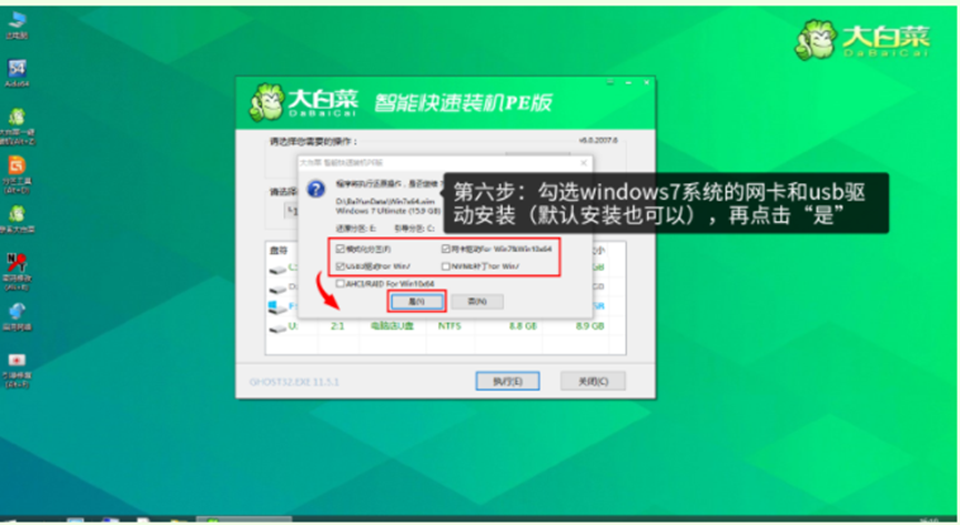 16、勾選windows7系統的網卡和usb驅動安裝,再點擊“是”。