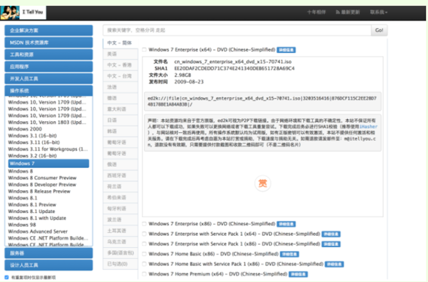 7、點擊需要下載的“操作系統”,在右側找到你所需的系統版本,點擊“詳細信息”,復制ed2k鏈接,使用離線工具下載。