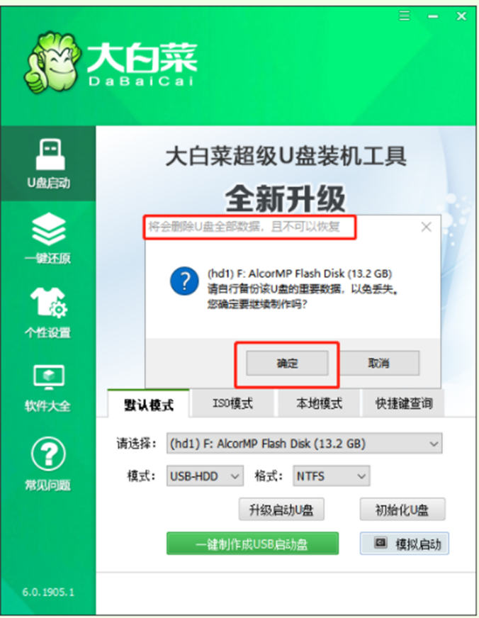 4、確認好u盤內的重要資料都已保存妥當,點擊確定。
