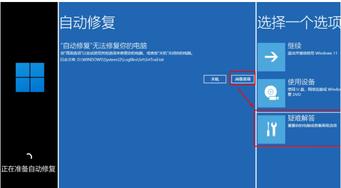 等待進入修復界面 - 查看高級選項 - 疑難解答。