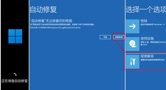 等待進入修復界面 - 查看高級選項 - 疑難解答。