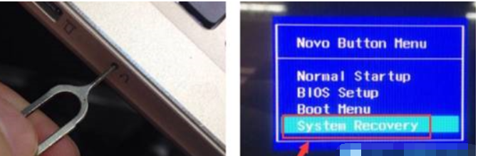 將聯想ThinkPad X13電腦強制關機,找一根卡針,插入筆記本的一鍵恢復小孔(不同筆記本恢復孔的位置不一樣),進入Novo Button Menu,按下方向鍵選擇,并回車System Recovery選項。