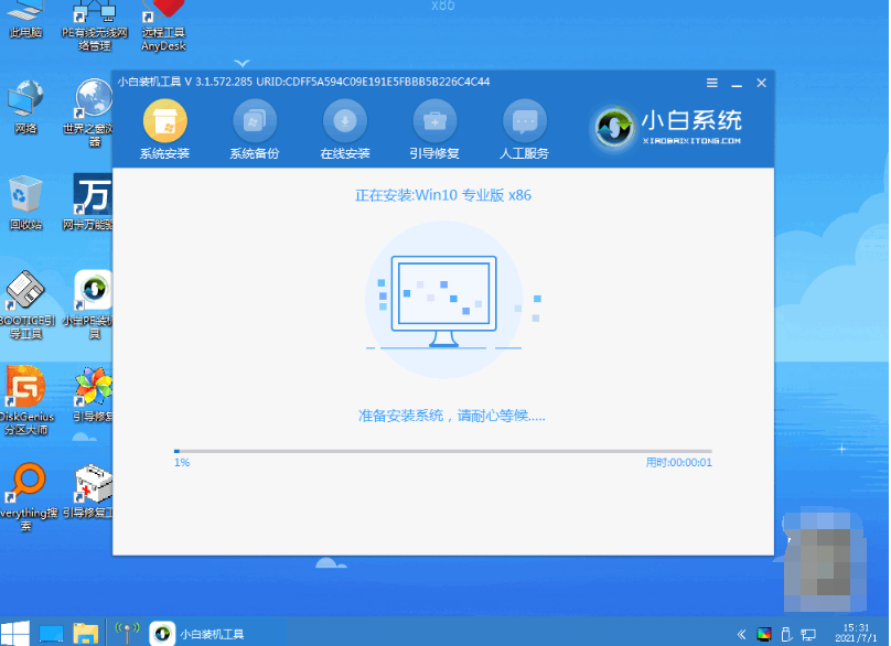 在pe系統內,小白裝機工具會自動安裝系統,完成后會自動重啟計算機。