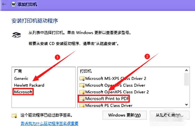 6、左側廠商中選擇“Microsoft”,右側打印機中選擇“Microsoft Print to PDF”,點擊“下一頁”,根據提示操作即可完成安裝。