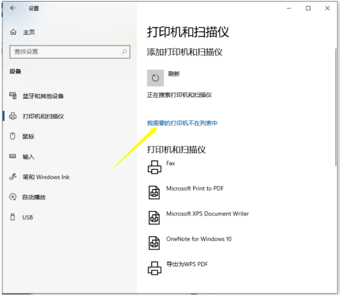 3、默認系統會自動搜索已連接打印機,如果提示未找到,點擊選擇“我所需的打印機不在列表中”。