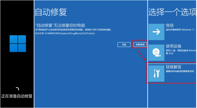 等待進入修復界面 - 查看高級選項 - 疑難解答。