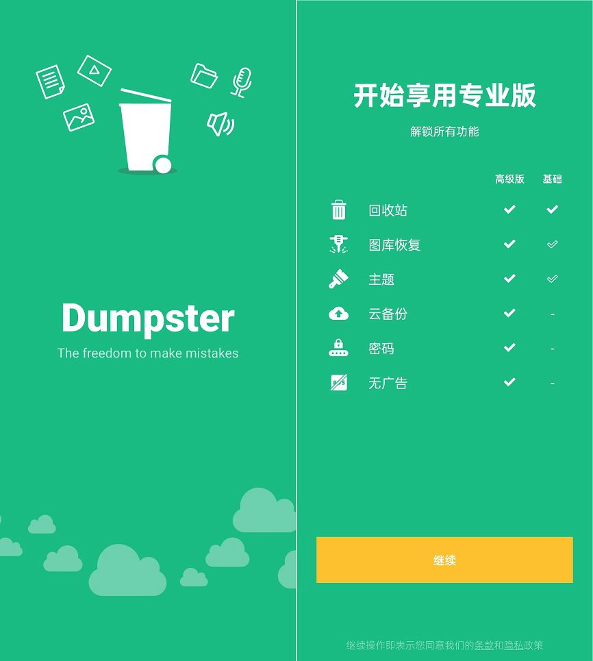 1、首先在手機中下載安裝“Dumpster回收站”APP,該軟件由于對系統權限要求較高,目前僅有安卓版,iOS 暫未找到類似工具。下載安裝后打開APP,可以直接看到已是專業版,免費無廣告,如圖所示。