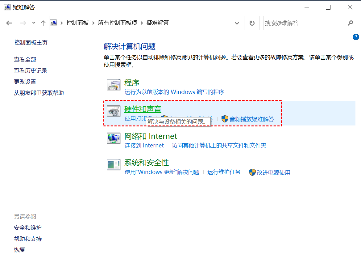 2. 進入“疑難解答”窗口并點擊“硬件和聲音”。