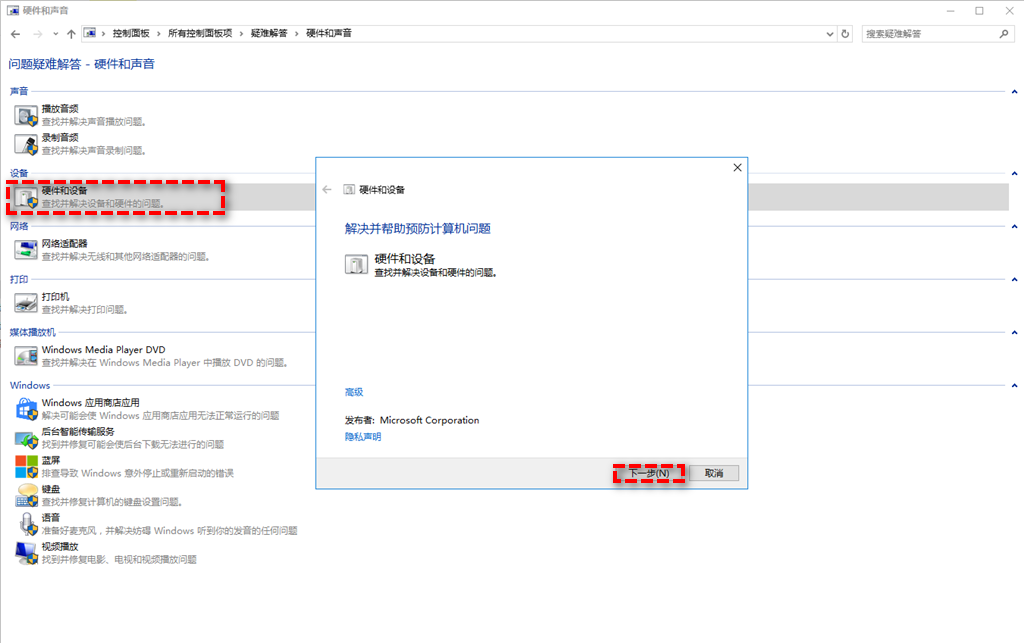 3. 點擊“硬件和設備”。在下一個窗口中點擊“下一步”。