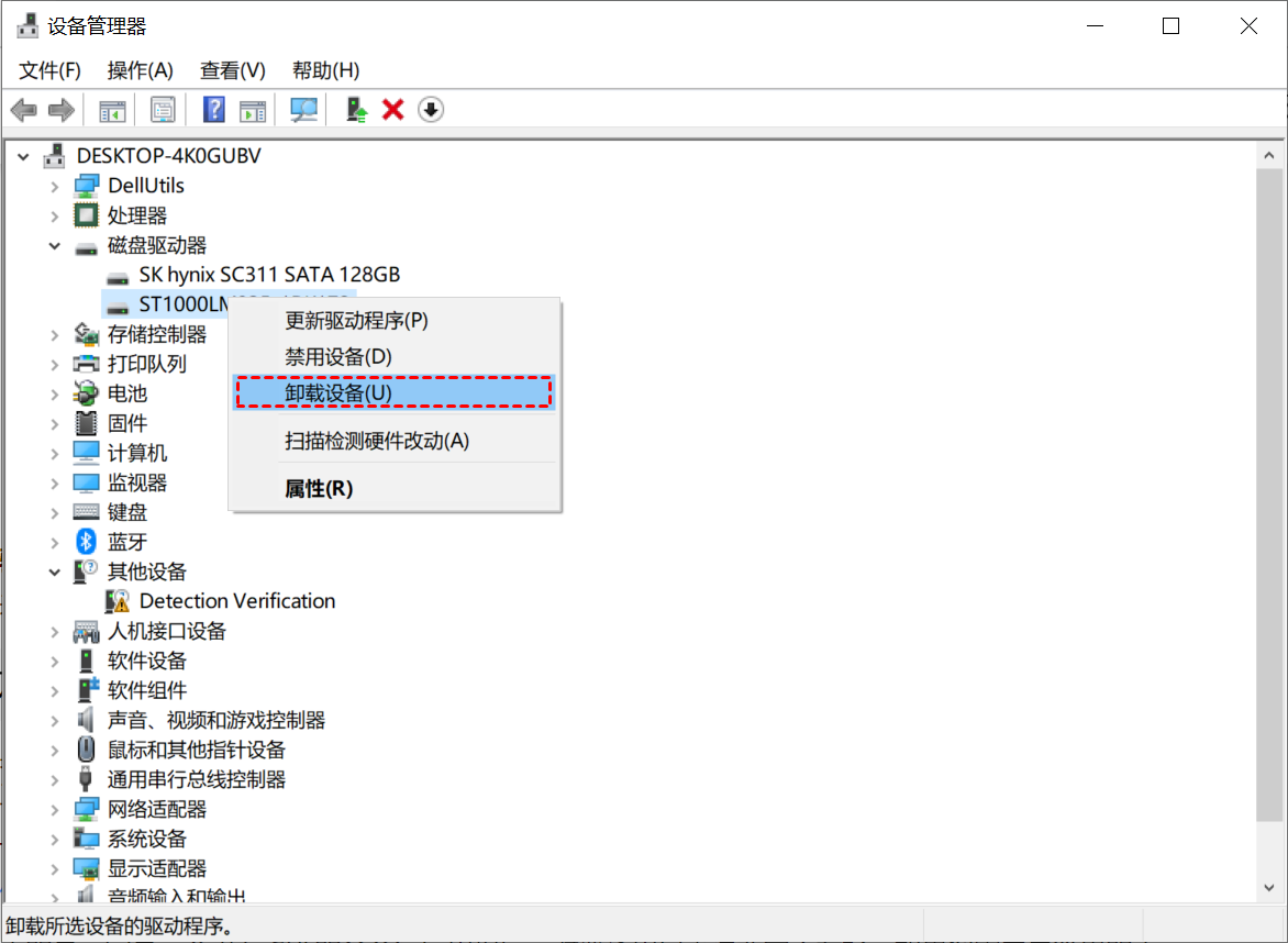 2. 右鍵單擊磁盤設備中的SD卡,然后選擇卸載設備。