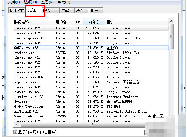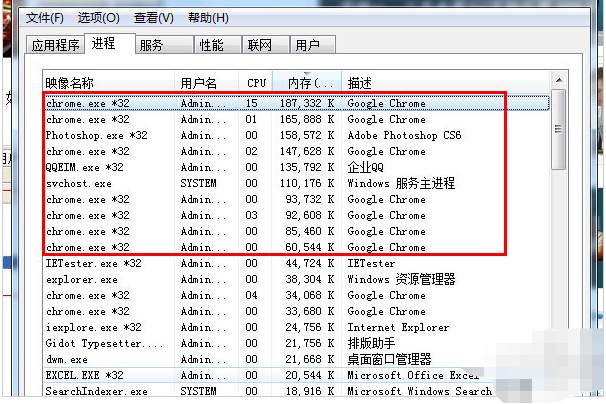 4、在這里我們即可清楚的看到占內存最大的程序是哪幾個,我們可以選中它,鼠標點擊“結束進程”即可輕松解決;