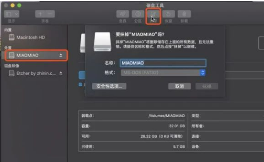 1、下載好windows鏡像,然后插入U盤,打開磁盤管理工具,選擇U盤后點擊抹掉.
