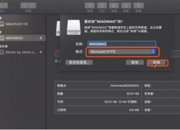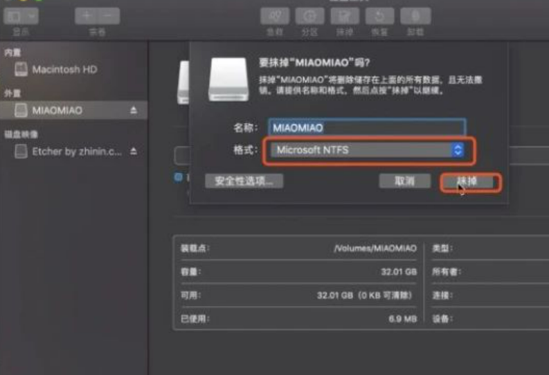 2、格式這里的下拉框選擇Microsoft NTFS,選擇之后點擊抹掉,(選擇Microsoft NTFS)