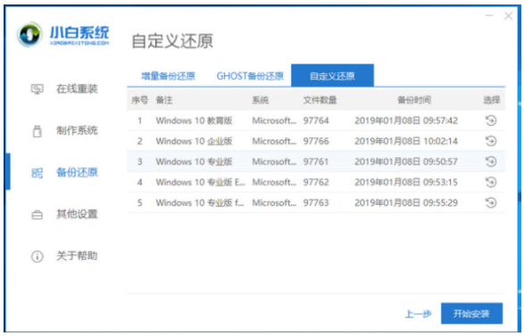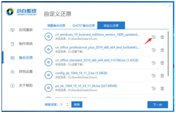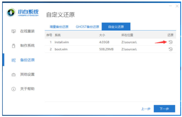 2、在小白一鍵重裝的備份還原界面內選擇自定義還原,鼠標點擊系統iso鏡像文件后面的還原按鈕。
