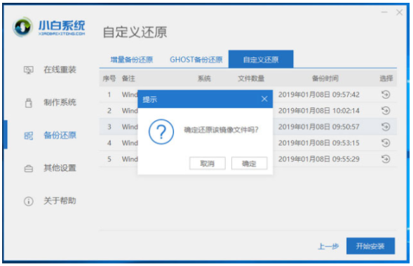 5、小白系統此時將會提示是否進行還原,點擊確定之后,小白系統會進行鏡像文件的拷貝以及安裝環境的搭建等等。
