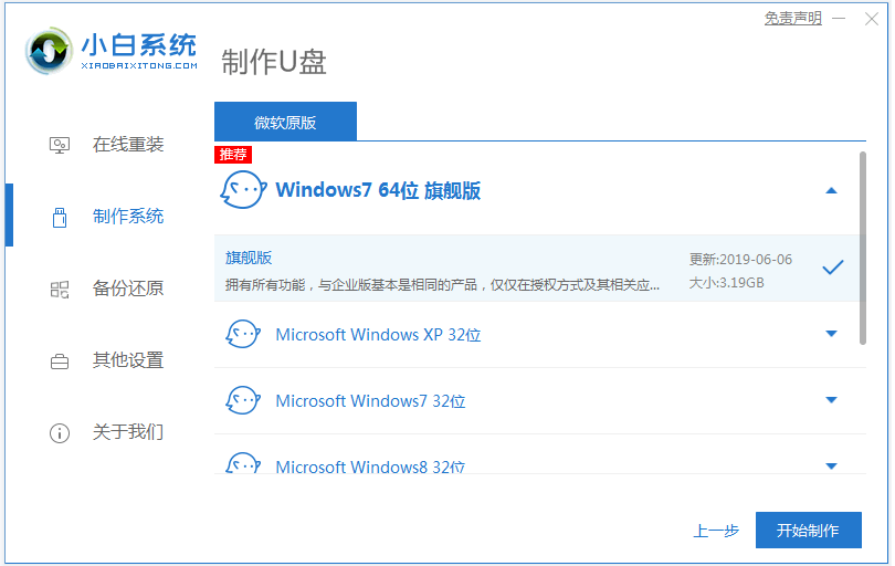 2、選擇需要安裝的windows系統,點擊開始制作啟動盤。