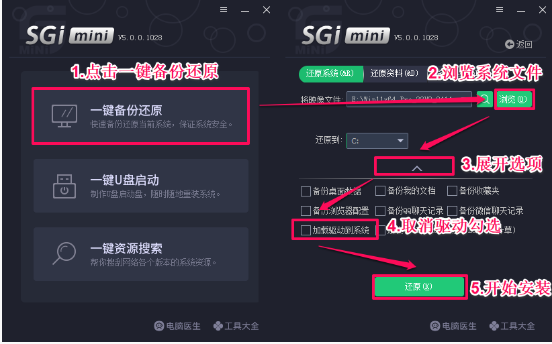 7、在出現的界面選擇一鍵重裝系統(SGI升級到5版本之后界面會不一樣了,下面是兩個版本的界面)。