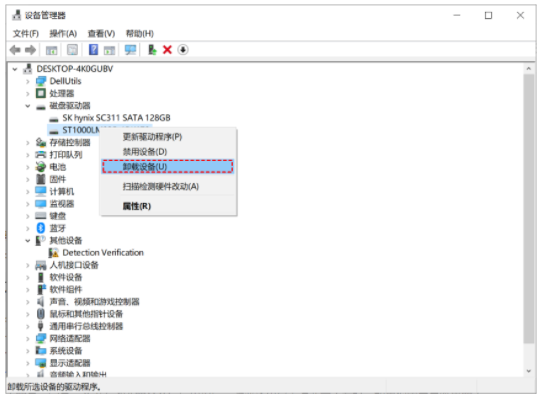 2、右鍵單擊磁盤設備中的SD卡,然后選擇卸載設備。
