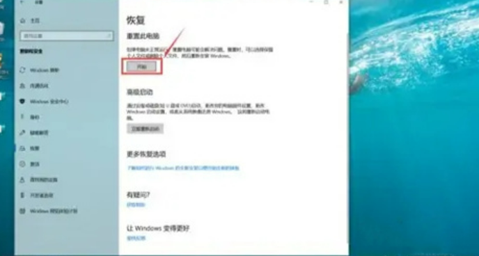 找到“更新與安全”選擇“恢復”。在“開始”按鈕,點開它之后選擇“刪除所有內容”就可以了。