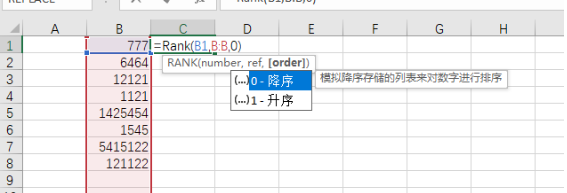 3、在括號里分別輸入參與排名的單元格、排名的數值區域和排序方法,0代表降序,1代表升序。