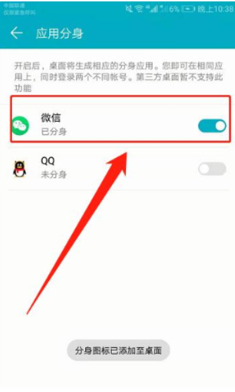 5.設置完成后,微信分身就設置成功啦,現在手機即可同時登陸兩個微信賬號。