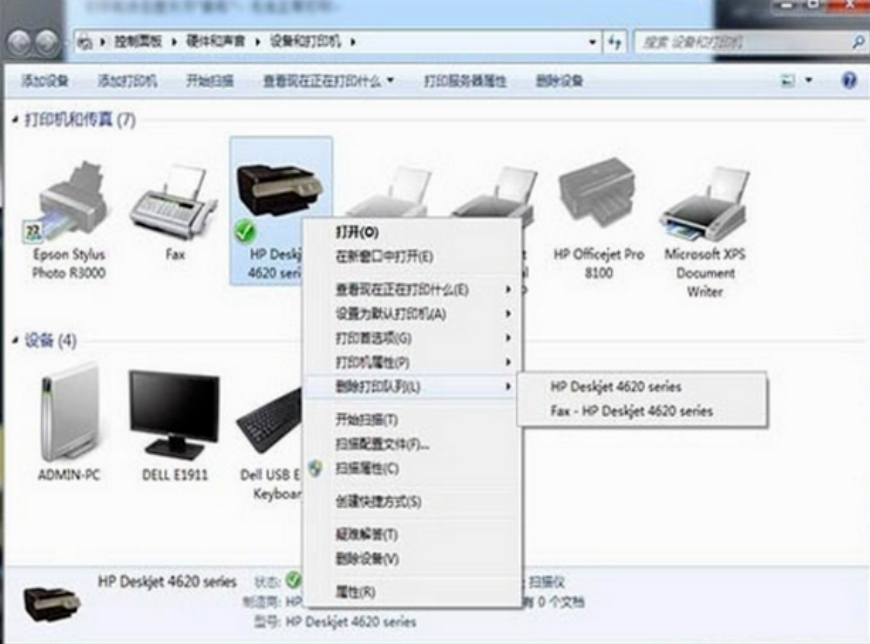 5、然后就是清除這些文檔,也就是刪除打印隊列。右鍵點擊打印機圖標,在彈出的菜單當中選擇刪除打印隊列(如下圖):