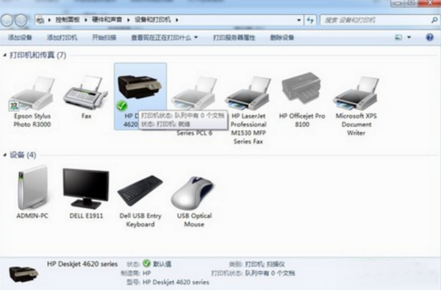 6、在執行完上述操作之后,重新啟動電腦和打印機,并將打印機通過USB接口連接到計算機上。這時候再次進入控制面板的打印機選項當中,在Windows7系統當中會自動將打印機回復到可用的狀態,鼠標懸停后,正確的提示信息應該為“打印機狀態:隊列中有0個文檔,打印機 就緒”。