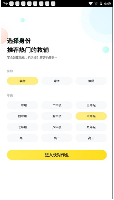 2、之后選擇你當前的身份(學生,家長,教師),年級,進入快對作業