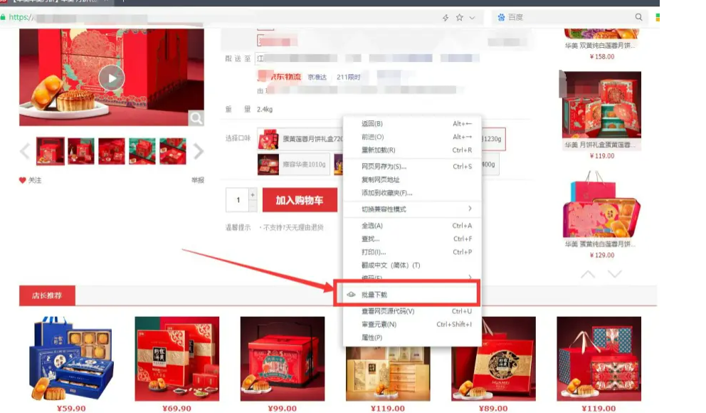2、打開你想要下載高清原圖的京東的寶貝詳情頁選擇批量下載的菜單。