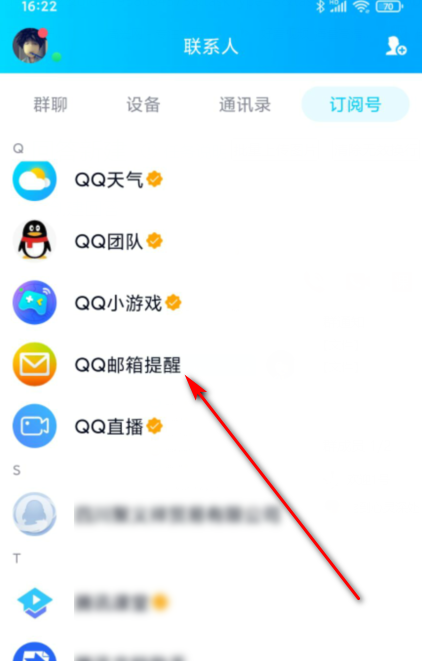 1、打開手機QQ,搜索QQ郵箱,點擊聯系人>公眾號>QQ郵箱提醒。