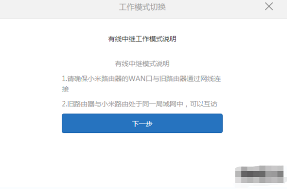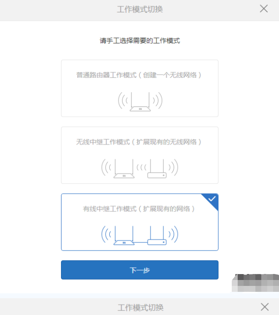 (2) 選擇有線中繼工作模式,下一步。