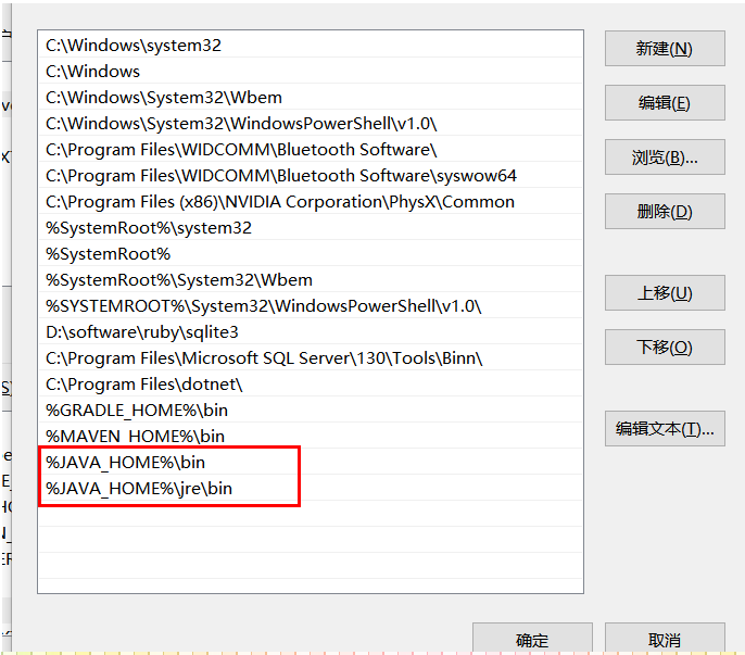 4、設置Path環境變量,這個變量已經存在啦,所以在列表界面中選擇Path,點擊下方的“編輯”按鈕,在彈出的窗口界面中添加如下信息:%JAVA_HOME%\bin;%JAVA_HOME%\jre\bin,點擊“確認”。