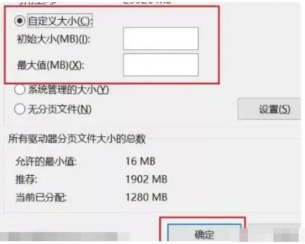 6、點擊“自定義尺寸”,初始大小設置為與內存大小相同的大小,最大值設為內存的兩倍,點擊OK,重啟電腦以完成設置即可。