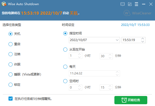 3、設置完成后我們只需要選擇開始任務即可按我們預定的時間進行執行自動關機即可。
