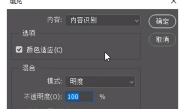 最后在填充彈窗的內容欄往下滑菜單里選擇內容識別,其他值按照默認設定就可以,點擊確定就可以去除水印。