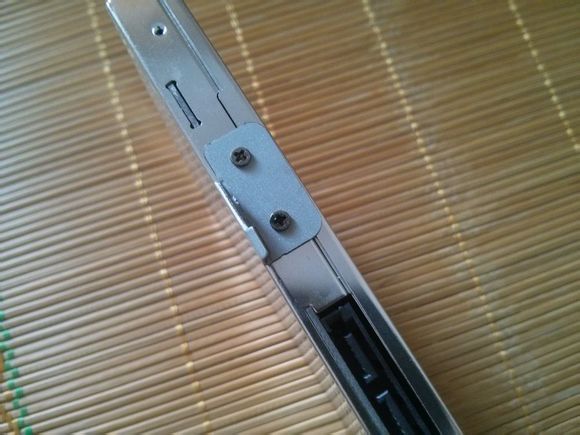 5.拆去光驅的外殼擋板,擋板裝在光驅位硬盤托架上*(固態硬盤厚度不夠?加塊紙片吧)