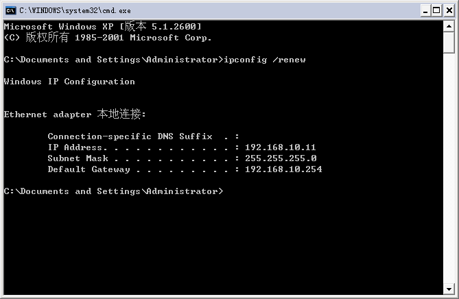 6.執行第5步的時候,本地網絡會斷開,最后再輸入“ipconfig /renew”,就可以重新獲取IP地址,獲取到的IP取決于路由器DHCP地址過期時間