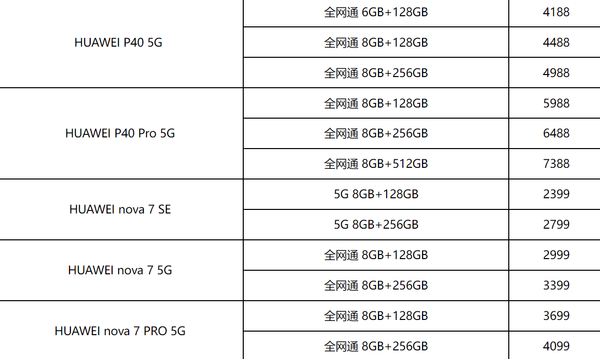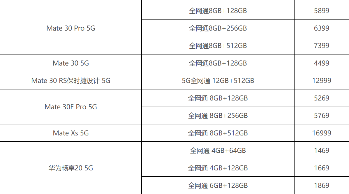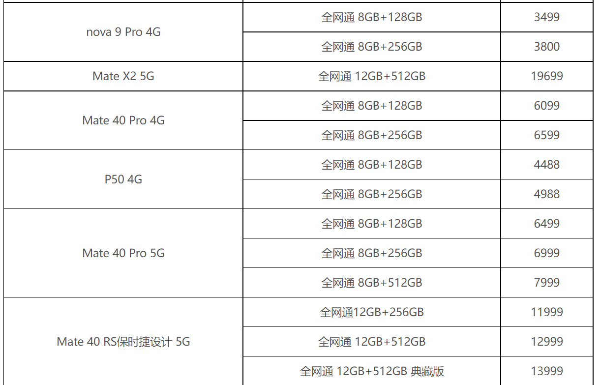 華為手機價格大全: