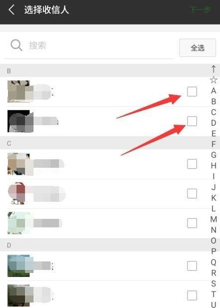 5、點擊“新建群發”,選擇收信人,對著要群發的朋友們右側的方框打勾或點擊全選,選中所有人。