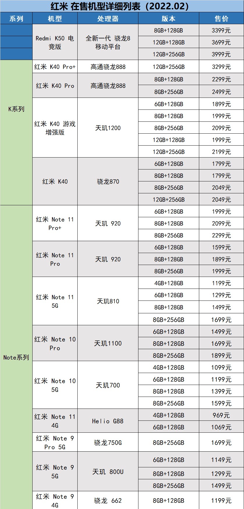 下面列出小米、紅米、黑鯊手機在售機型梳理表,以系列劃分,重點呈現處理器與各版本的價格對比。手機款式相對豐富:(以下價格為某個時間點價格,非實時價格)
